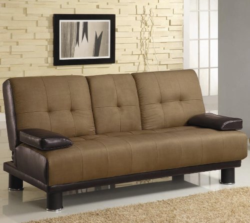 This versatile Sofa Bed by Coaster is upholstered in two tone combination for a sharp classic look. It features durable microfiber fabric and brown leather like vinyl. It also features a drop down center compartment for cup holders and ratchet back mechanism that folds down to make this piece a comfortable sleeping solution. Dimensions: Sofa 72"L x 36"W x 35"H