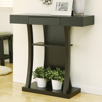 EL-29308 Features: -Smooth spacious table top with 1 center drawer for storage.-Bottom open display area.-Elegant curved front base.-Elegant table is at a suitable height perfect for hallway or behind a sofa. Construction: -MDF and strength enhancing veneers construction. Color/Finish: -Warm matte red cocoa finish. Dimensions: -Base dimensions: 1.75''H x 23.375''W x 11''D.-Overall dimensions: 34''H x 36''W x 12''D.
